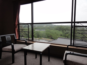 景色は山。 ちょこっと見えてる屋根は離れの観月亭。露天風呂付き客室が10部屋あるようす